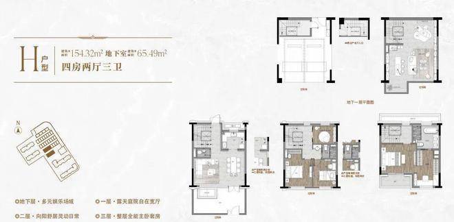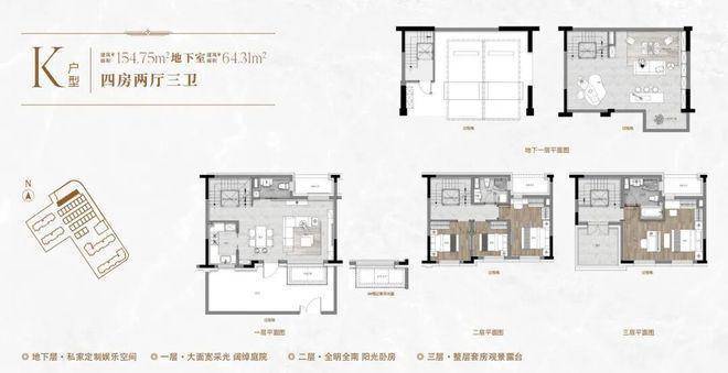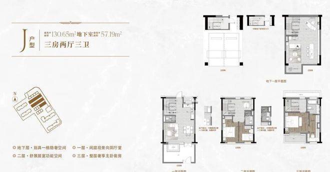 一楼和地下室主社交和志趣,二楼是子女的房间,三楼是主人休憩区。