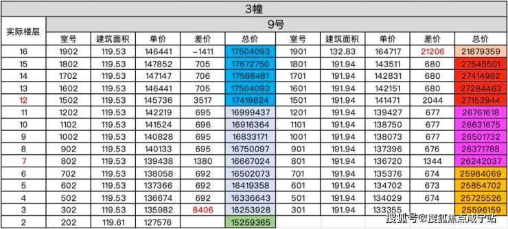 3幢因为位于南侧第一排,从7楼开始会有一定江景视野,从12楼开始江景视野就很不错了,所以分别有两次跳价。