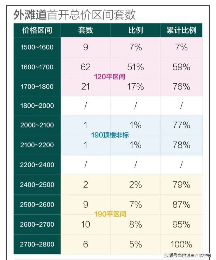 三个户型总价段完全不交叉,120㎡主力总价段在1500~1700万之间,190㎡主力总价段在2500~2700万之间,2500万以内还有两套西边套房源。