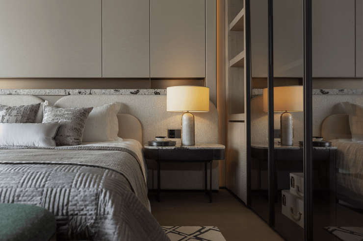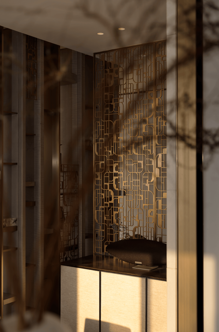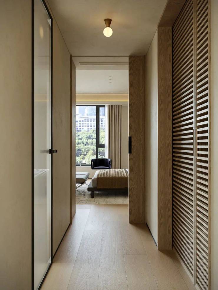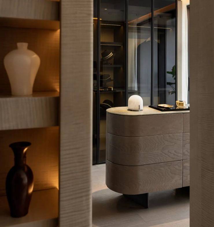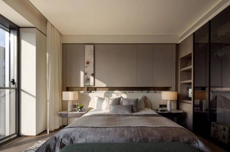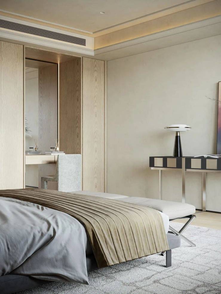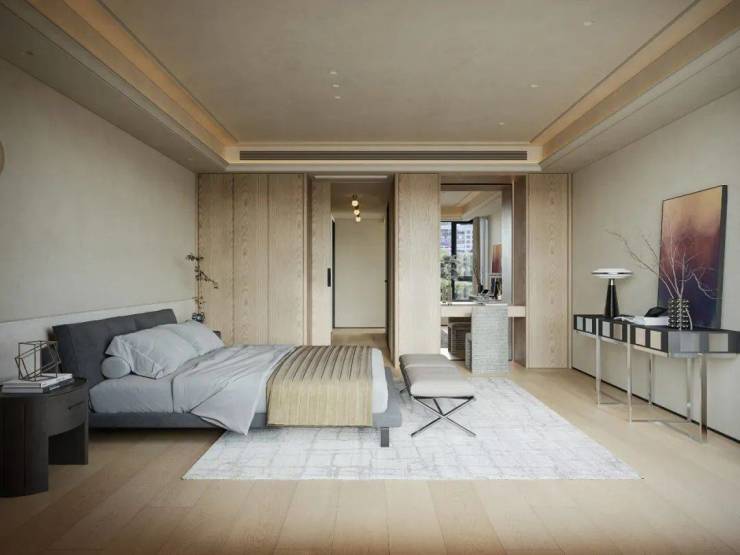 主卧采用留白设计,保留部分家具,摒弃繁复装饰与色彩堆砌,以形体美、轻重色和谐及精准功能布局满足家庭需求。洞石纹板与原生木色搭配,低饱和色调奠定幽远宁静基调。简练线条与天然材质纹理交织,褪去冗余,在素净空间中营造出温润的时光质感。