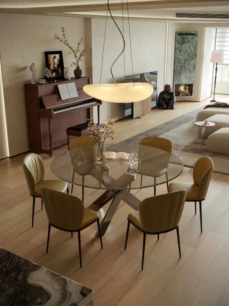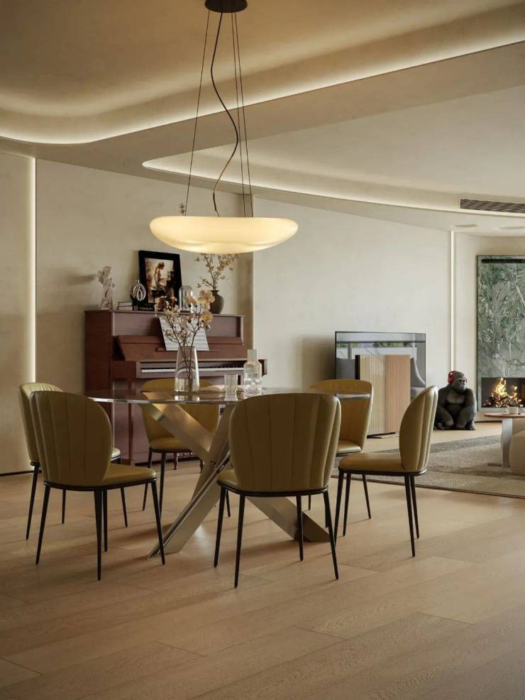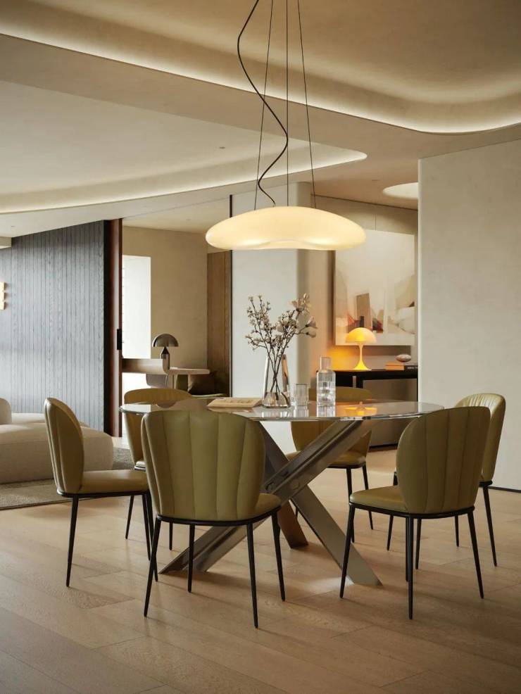针对长方形客餐厅原始结构,选用圆形餐桌打破直线刻板感,以柔和线条注入灵动气息。无棱角设计消除磕碰隐患、优化动线,使空间穿行更流畅。客厅至餐厅,顶面弧线与圆形餐桌形态呼应,丰富空间层次的同时保持整体和谐,让规整空间焕发生机,成为承载生活诗意的剧场。