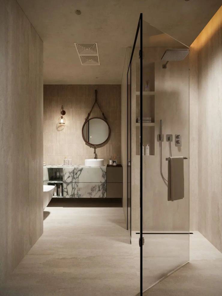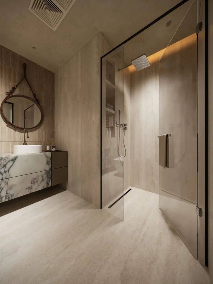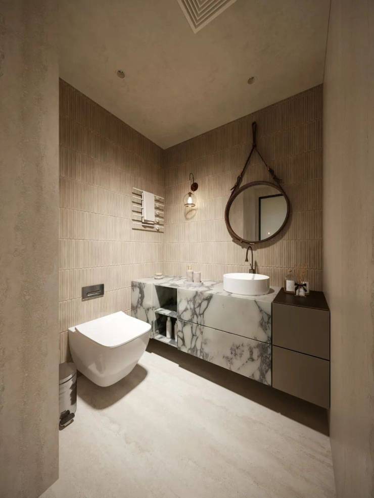 次卫通过墙体布局调整,拓展活动空间并提升收纳能力,延展洗手池增强使用便利性。在风格设计上,洞石砖与拇指砖搭配铺贴,洞石砖天然纹理彰显自然美感,同色系拇指砖打破单调,二者相辅相成,在有限空间内打造出兼具实用性与艺术感的卫浴空间。