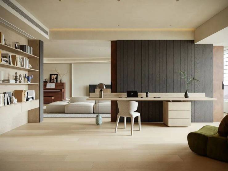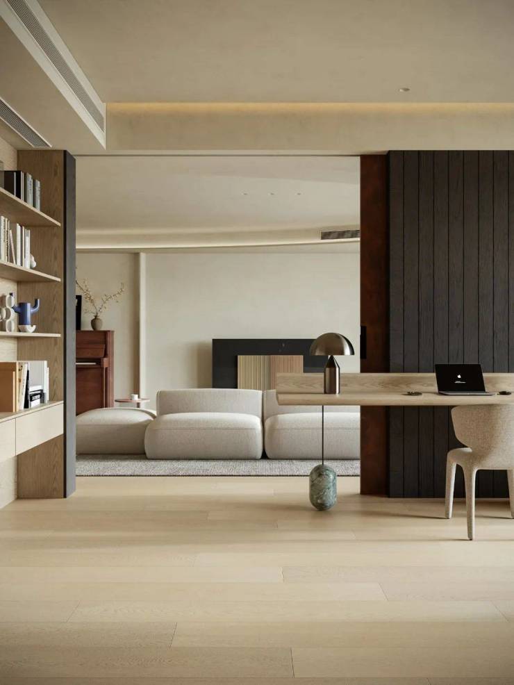 拆除卧室原有隔墙,拓宽空间尺度,引光入室勾勒家的轮廓。口袋移门隐于饰面板隔墙内,赋予书房未来独立成卧的灵活可能。温润木质书桌搭配黑色木饰面,划分功能区的同时,增添空间层次感与韵律感。共享区与多功能书房相互呼应,实现 “各享其趣,抬眸可见” 的理想互动场景。