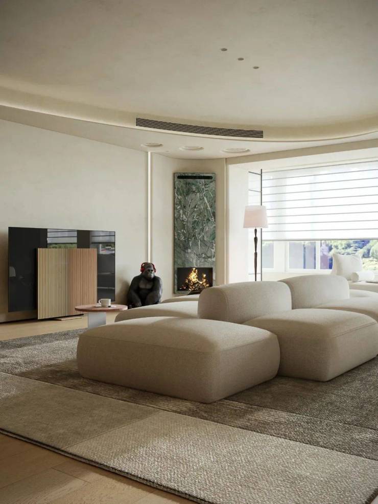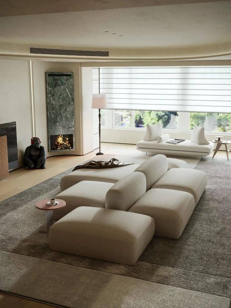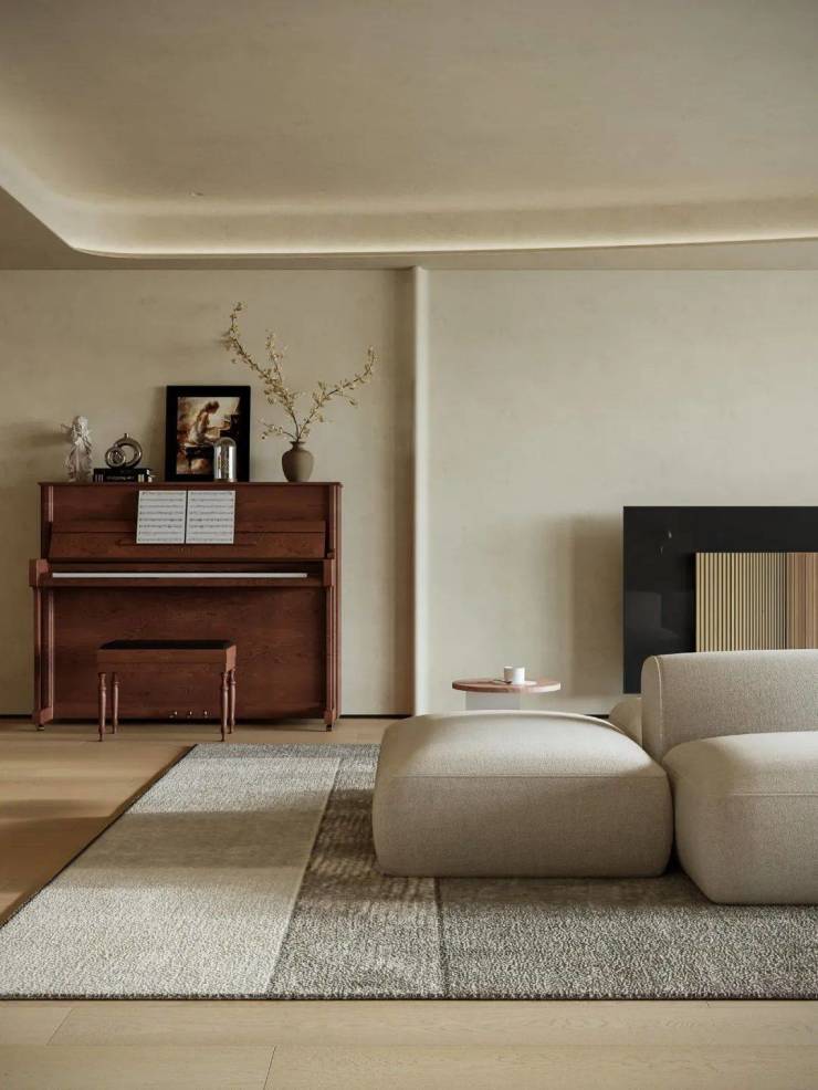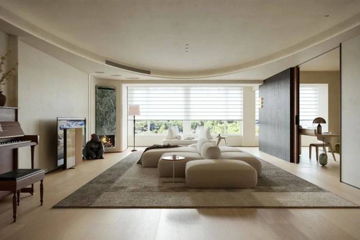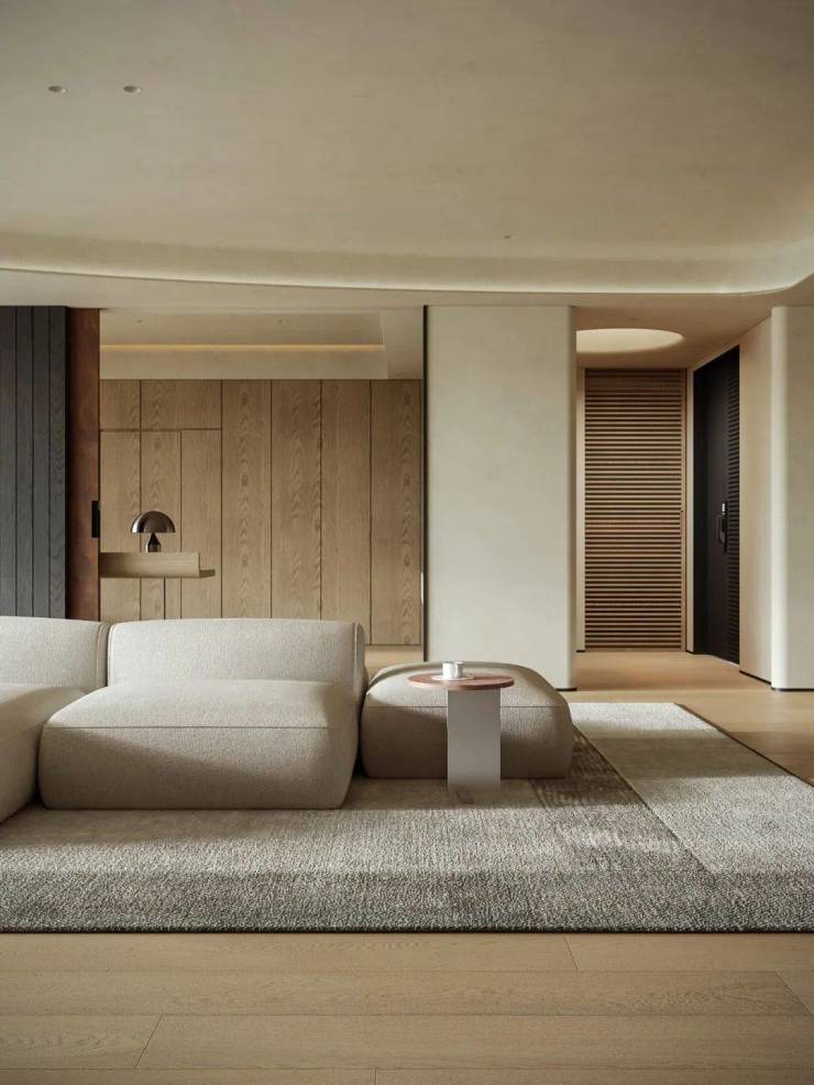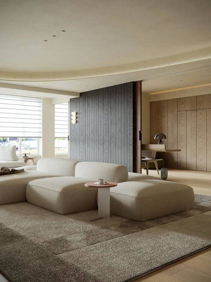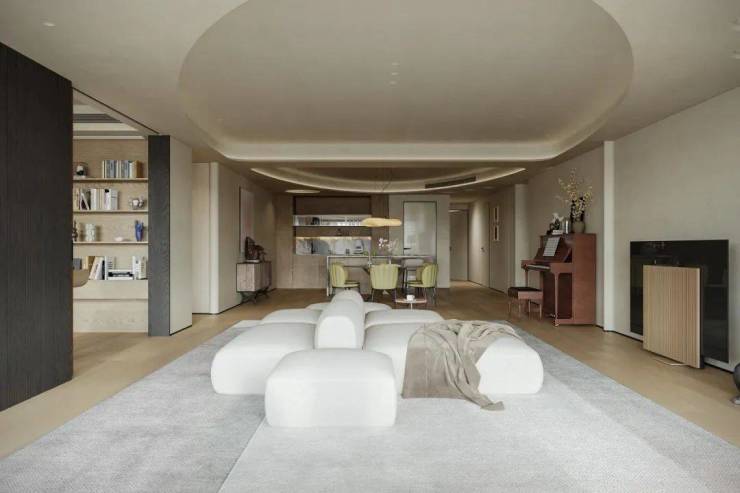为营造自由通透的空间感,我们规划流畅生活动线。米灰色低饱和模块沙发,以多面体块拼接造型,灵活适配不同视角与布局,成为家庭核心区焦点。它与多功能房、餐厅、水吧等区域形成视觉呼应,构建出 “平行陪伴” 的温馨生活场景。