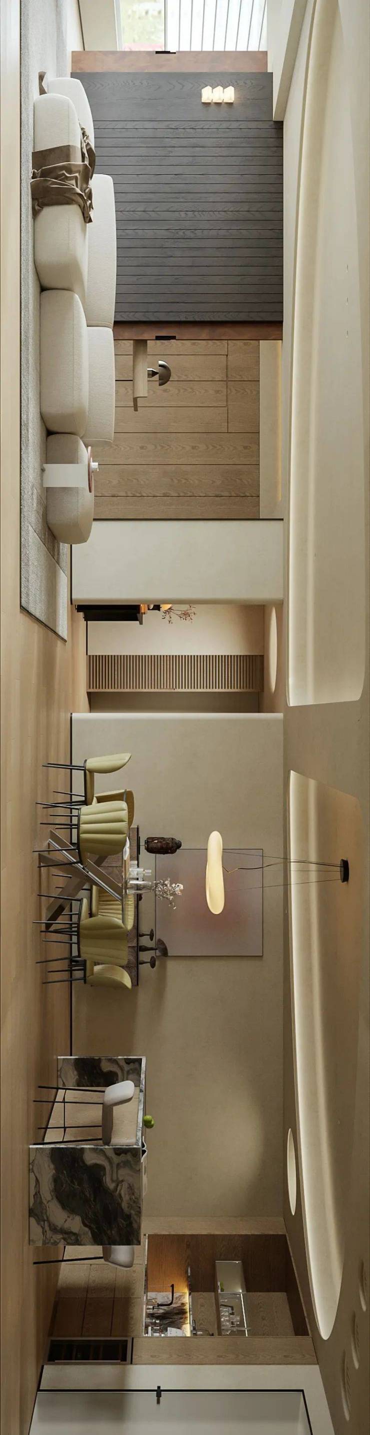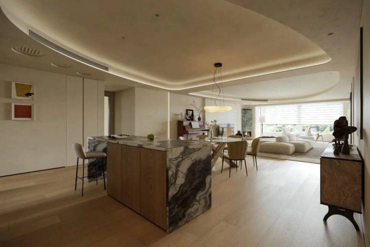 客餐厅以连贯视角奠定视觉基调,顶面弧线替代尖锐线条,贯穿空间削弱压迫感,延伸视觉开阔度。柔和暖色调交织出丰富层次,搭配弯曲线条勾勒轮廓,营造松弛宁静的生活氛围,弧线更成为串联空间的点睛之笔。
