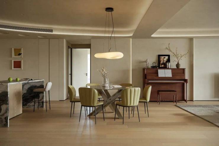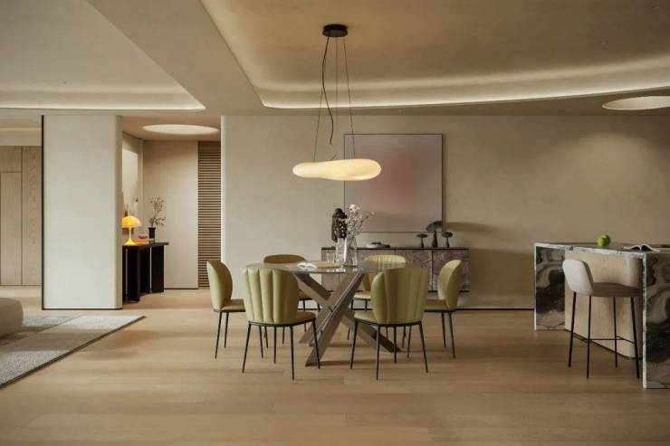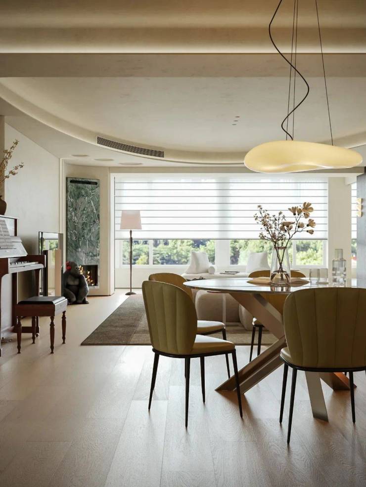 客餐厅连贯视角构建稳定视觉基调,梳理空间明暗层次。柔和温暖的主色调中,不同色彩交叠营造丰富层次,搭配弯曲线条勾勒空间轮廓,传递松弛宁静的生活氛围。