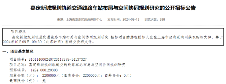 另外有一点值得重点一提:9月13日,上海政府采购网发布《嘉定新城规划轨道交通线路车站布局与空间协同规划研究的公开招标公告》。