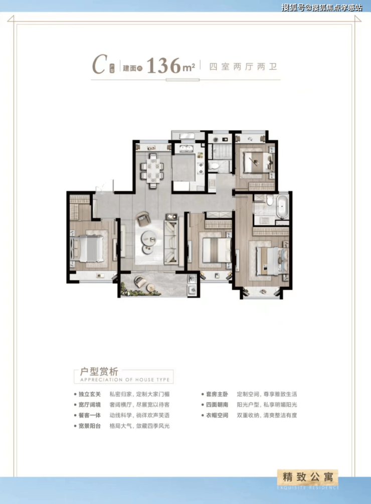 建面约136㎡4房2厅2卫户型特点:做到了四开间朝南+全卧飘窗+主卧套房设计+南北通透+客卫干湿分离,一步到位的改善型大4房。