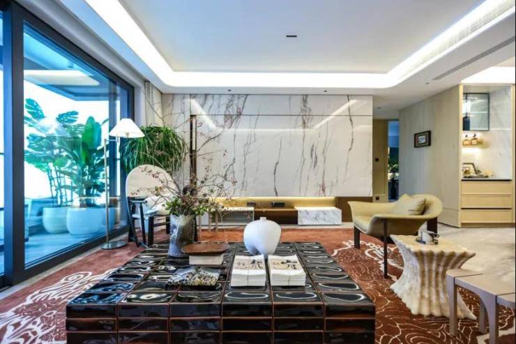 建面约170㎡户型的1楼入户大堂也非常气派,地面是大理石拼花,墙面是花岗岩,弧形吊顶+隐藏射灯,整体形成了低调隐奢的感觉。
