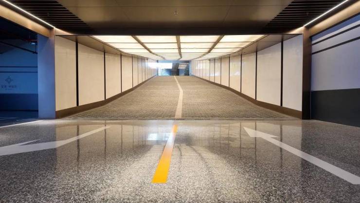 坡道墙面以进口石材、透光云石与金属线条组合,灯带延伸如“光影缓冲带”。