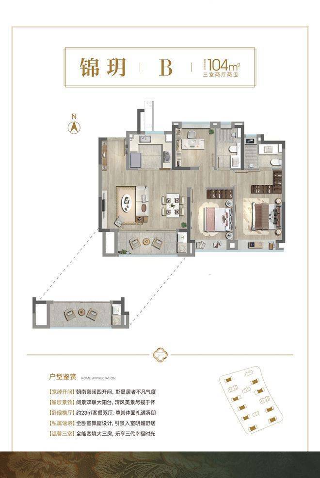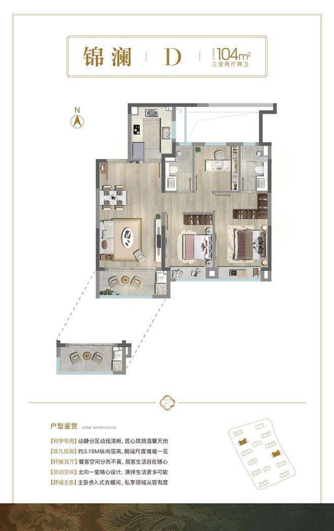 3)建面约104㎡3房2厅2卫,中间套D户型
