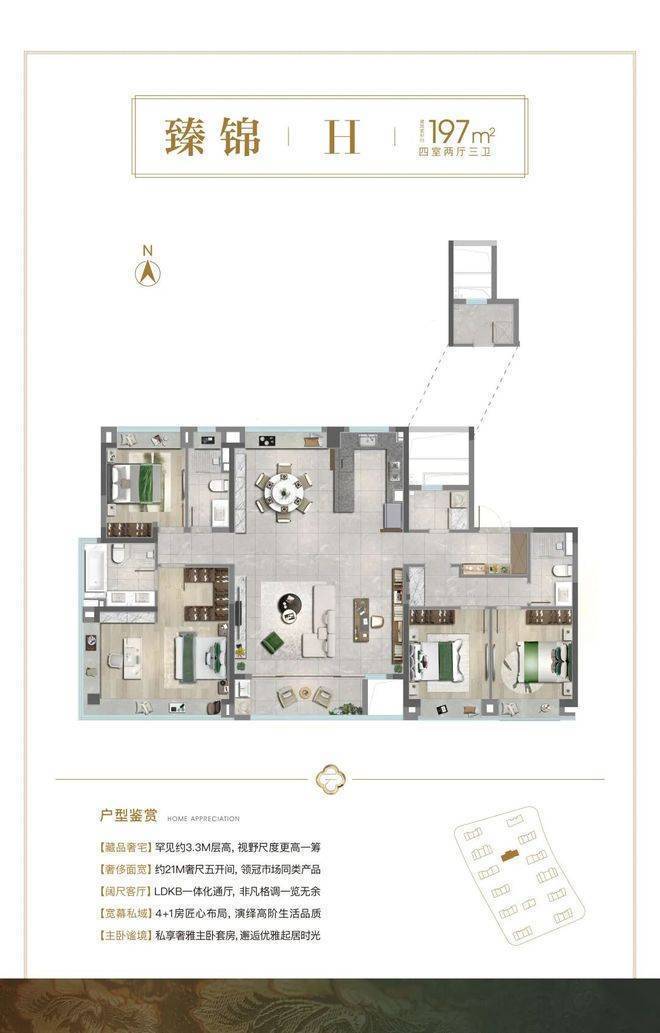 项目层高达到约3.15-3.3米(103-166㎡户型是3.15m层高,197㎡户型是3.3m层高)。
