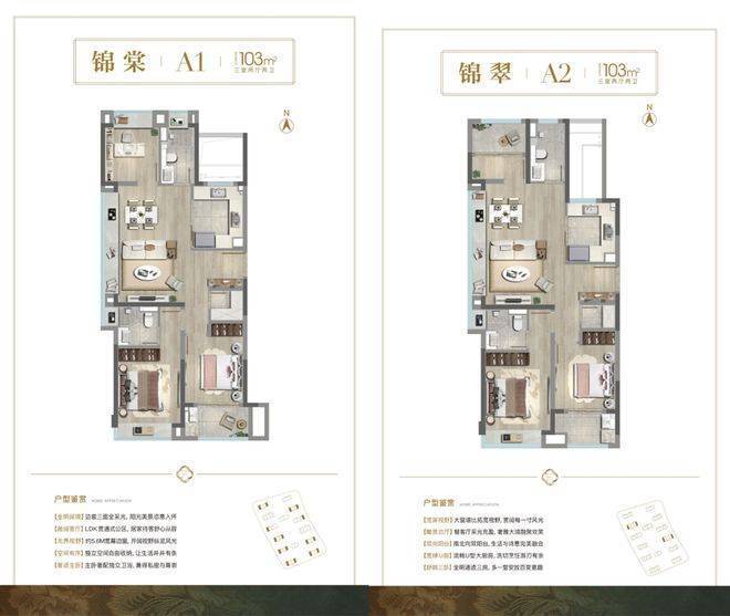 这2个户型都是进阶改善产品,做到了独立电梯厅+超大面宽采光面+南向双套房设计。