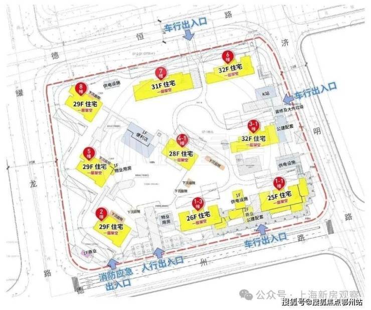 根据项目规划设计方案,项目拟建9栋25-32层高层住宅。全部楼栋均采用一层架空设计。项目采用完全式人车分流设计,人行主出入口位于德州路,三个车行出入口分别位于位济明路、德州路和德恒路。