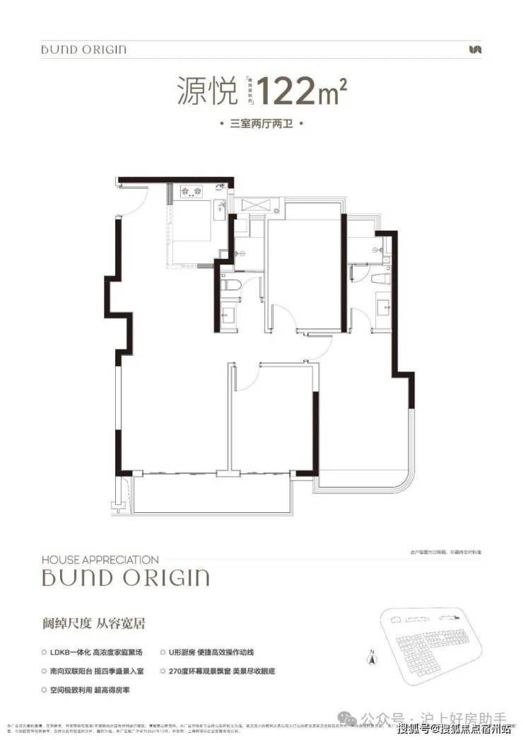 建面约122㎡3房2厅2卫,非常标准的动静分离、三开间朝南户型。