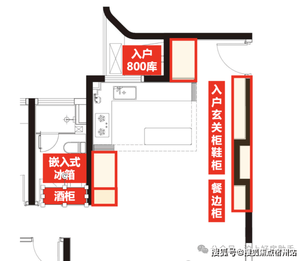 通过示意图我们会看到,一般项目的玄关柜处于成本原因只会做到下图中间位置的冰箱位置就结束,而外滩源著在标配的双开门冰箱(小户型博世或同等品牌、大户型利勃海尔或同等品牌)左侧还额外交付有完整的储物空间: