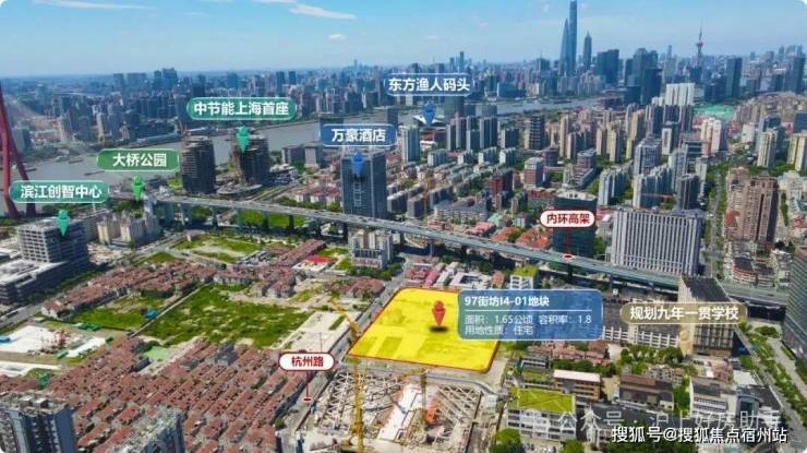 97街坊I4-01地块建设用地面积16482.71平方米,土地用途为普通商品房(二类住宅组团用地),容积率1.8,计容建筑面积29668.87平方米,位于黄浦江新质秀岸区段的“动韵桥芯”实施单元内,空间意向定位为“百年新秀带、活力桥头堡”。