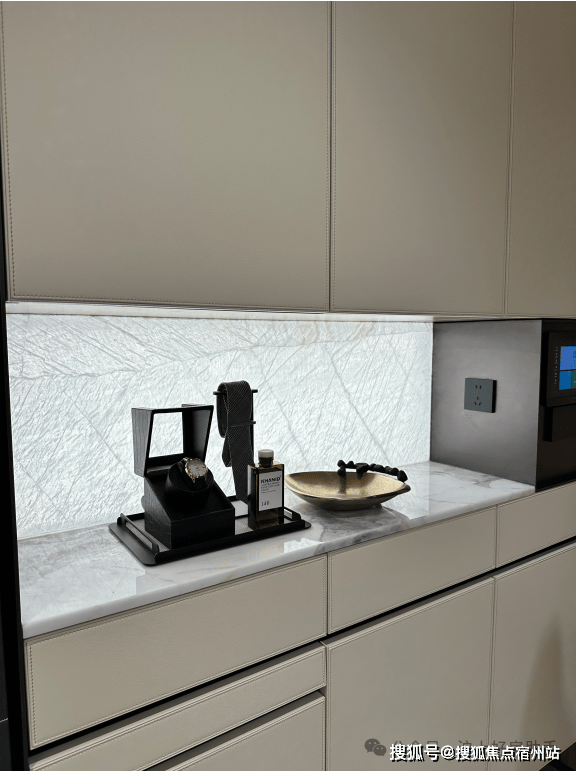 进到实地约99平样板房,整个玄关柜几乎全部都是皮质缝线包裹,细节拉满;