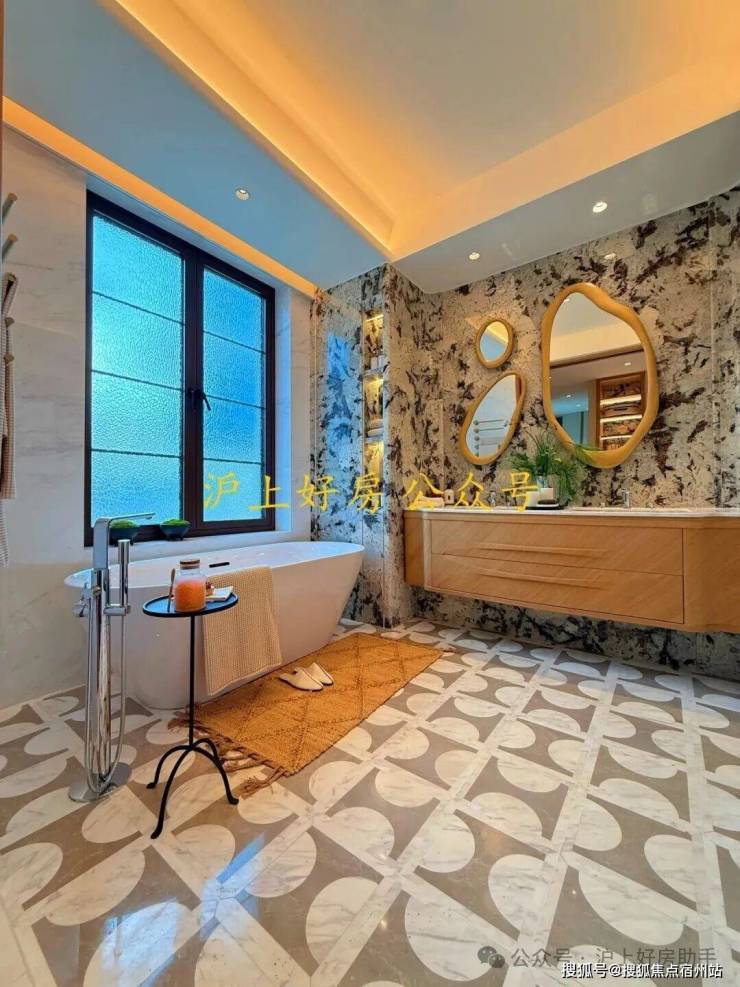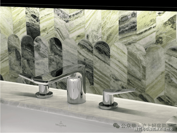 基础硬件都不差,项目在审美上还做了不少创新——卫生间大量采用奢石和石材,比如主卫柜体墙面就是香格里拉翡翠拼花,龙头是冷热分离式,成本更高: