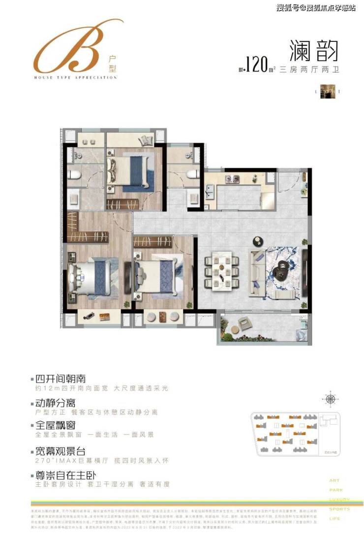 约120㎡3房2卫的户型,整体的尺度感相当惊艳。相比一般的紧凑型4房户型来说,这个户型的各个空间都非常宽奢,适合改善型家庭。