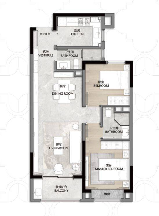 建面约94㎡宽阔两房,非常适合单身或是年轻的小家庭置业。其得房率最高约79%,相较于市面上大多70-75%的项目,实实在在地省下了不少空间的置业成本!