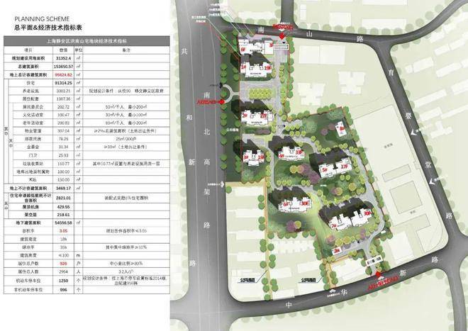 而北侧靠近南山路一侧还规划一幢最高6层的养老设施用房。在小区南北两侧的中华新路和南山路分别设有机动车出入口。