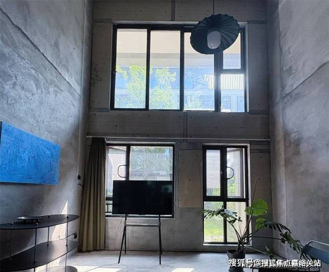 距离更远的窗户下方直接放支架电视,因为是一楼,窗外还有个小小的草坪院落,坐在沙发上望着窗外绿意盎然,仿佛屋内的毛坯房风格也不那么冰冷无趣了。