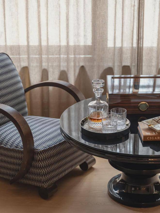 客厅另一端,是连接房内与外景的介质空间,在这里主人和客人可以享受美酒雪茄。看似独立的空间,实际延伸了客厅的功能,也延伸了窗外景观到室内的视线。