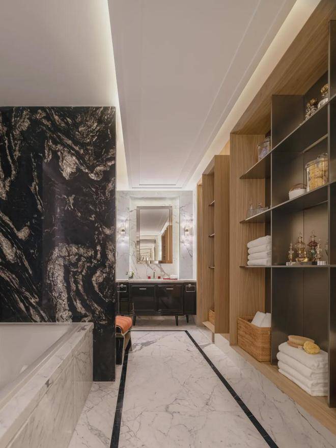 秩序,是主卫浴空间布局的重点。两个独立台盆相对而立,分属男女主人,营造出从容自如的使用体验。大面积运用黑白撞色大理石,让空间的秩序美与材质的自然美融合,颇具观赏韵味。