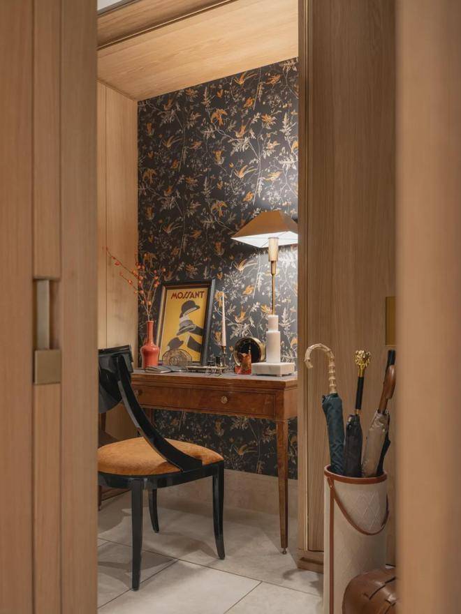 玄关具有变化性与功能多重性,壁纸融合中西方色彩和纹样,除了更衣功能,更摆放了古董书写桌,以手写文字传递信息,传递慢节奏生活方式,丰富空间的装饰和功能,目光所及视角变得丰富。