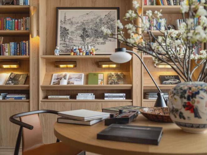 多功能书架彰显着设计的巧思,形成有如博物馆般的展示方式,即可放置日常读物,亦可展示珍本藏书。同时,利用屏风做隔断,与圆桌结合形成私密空间。