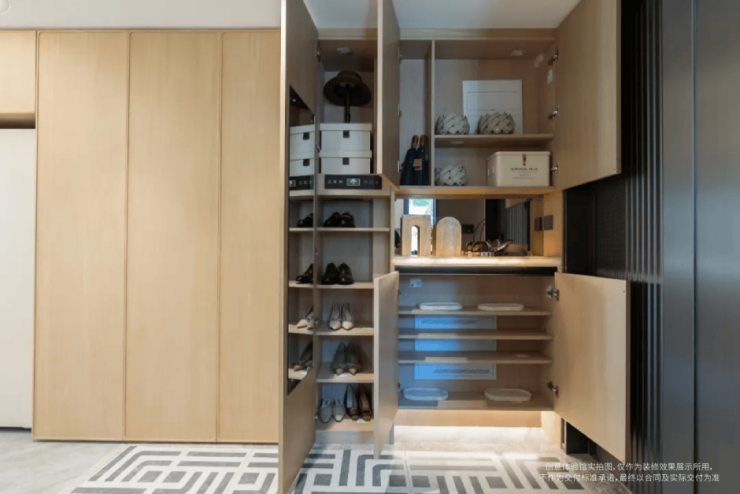 不管是小碗、大碗还是其他特殊餐具,都有不同的大小规格的抽屉可供整齐的摆放。让整个厨房的空间,得到充分的“扩容”。满足业主对于烹饪、收纳的所有需求。其次还有玄关部分: