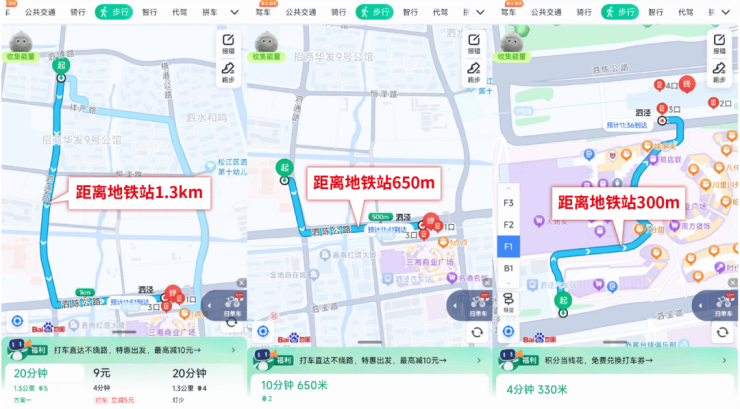 不同的距离步行到地铁站的差距有多少呢?来看百度地图的测距: