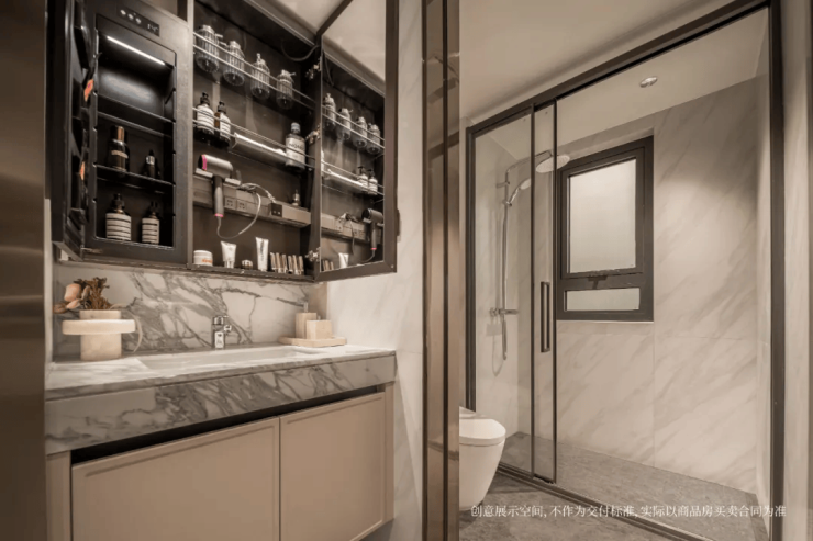 尤其是卫生间的镜柜,使用了内外双镜,并且内部的收纳空间相当丰富,小到女主人的发箍、面膜、口红、香水,大到吹风机都有适合的位置。