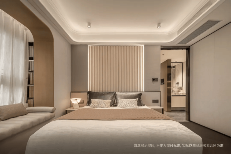 整个主卧尺度感是非常宽绰的,加上飘窗带来的视野延展以及收纳空间,居住舒适度拉满。
