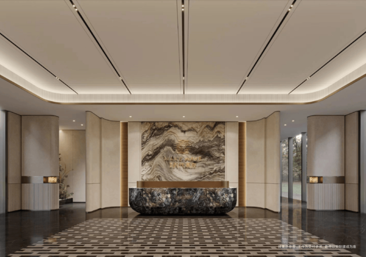 顶部采用香槟金色的斜角造型铝板,搭配手工打磨的星空顶及氛围灯,地面铺设仿石砖,墙面基调则借鉴了华尔道夫酒店的浅米黄色系大理石,并配以精致的礼仪灯设计。