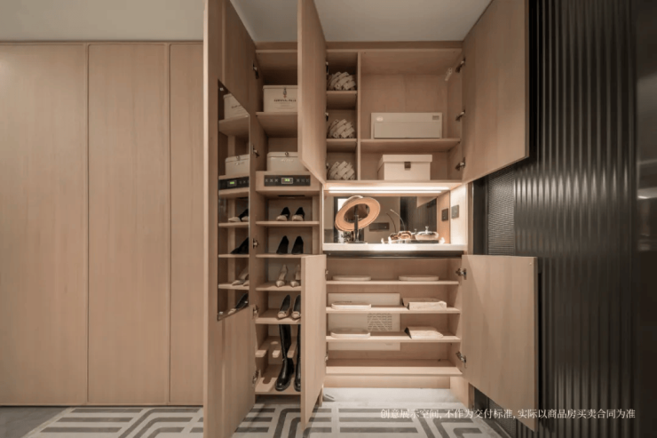 玄关收纳更精细,每个格子的规划都很贴近生活,随手物件、女主人的高靴、扫地机器人等都有各自安置空间。