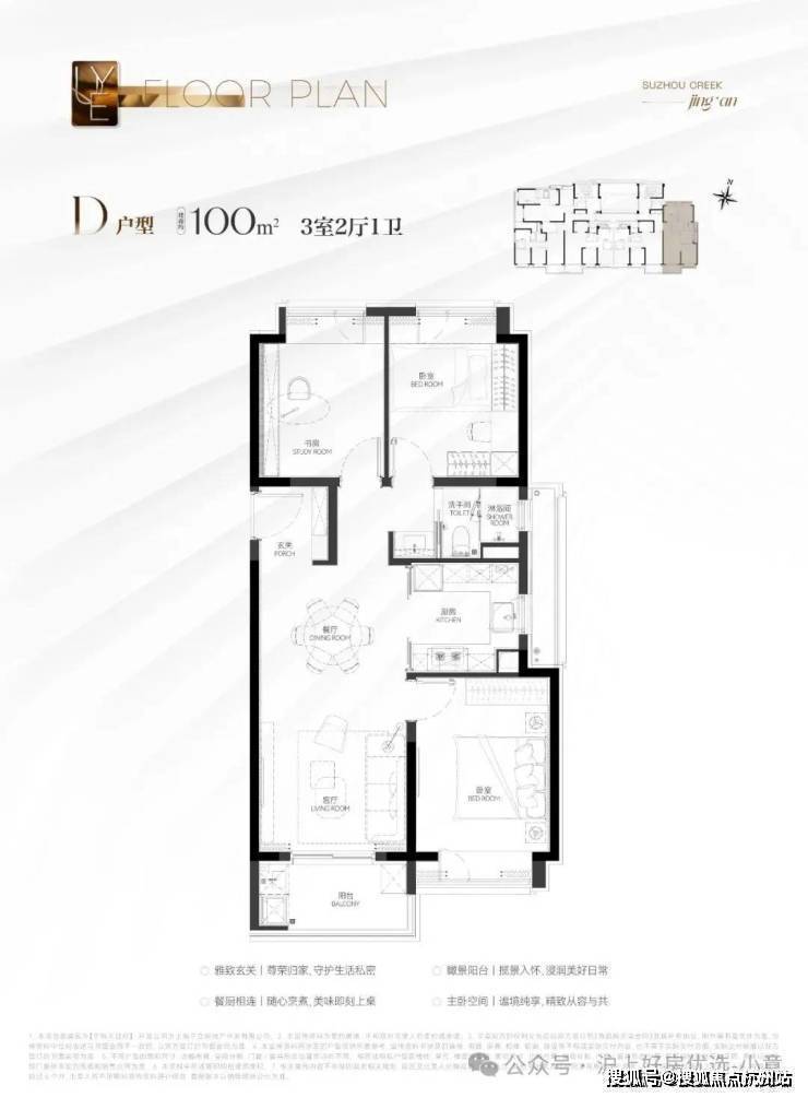 建筑面积约100㎡3房D户型:南北通透的设计让该户型拥有更加优秀的通风效果。而且这个户型做到了全卧飘窗(3个飘窗)+南向瞰景大阳台,丰富的灵动空间提升了实得面积!