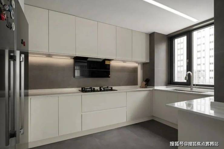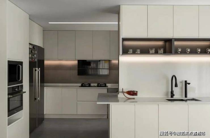 厨房做了很多收纳空间,将厨具和厨房电器完美的收纳,空间看上去更加干净整洁,白色的石材橱柜干净整洁,洗切炒动线流程,满足多种烹饪需求.