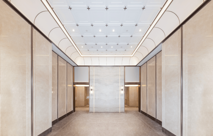 私宅标准延展到公区,大堂、电梯厅、电梯、入户厅四大区域一体化,解构主义遇见东方礼序,精工织就的穹顶叙事。