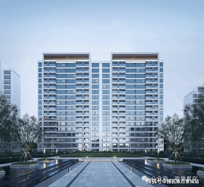 通过简洁的线条勾勒出清晰的建筑轮廓,通透的玻璃面展现出建筑的轻盈之姿,类公建化的立面形象呈现端庄典雅的气度