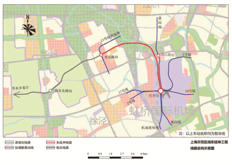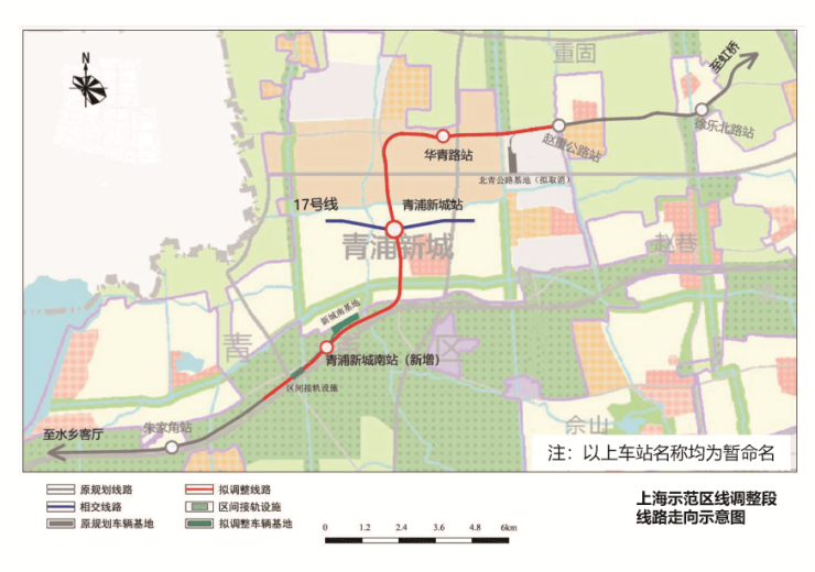 日前上海示范区线规划调整,将由芳乐路直接向东延伸至虹桥枢纽,新增青浦新城南站等。