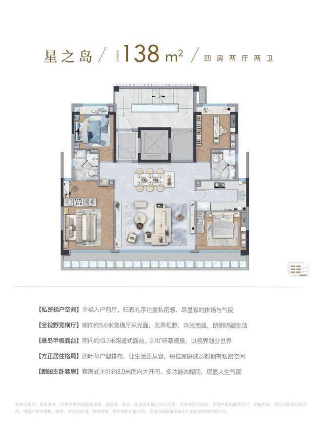 这个四房虽然建面只有138㎡,但因为是5层叠墅的高得房率,以及室内空间的高效利用,其功能和尺度感,给人的感觉十分惊艳。