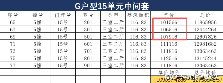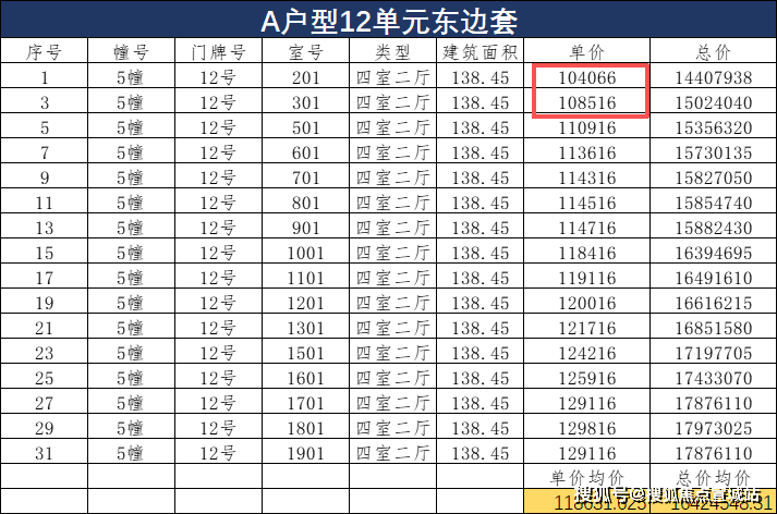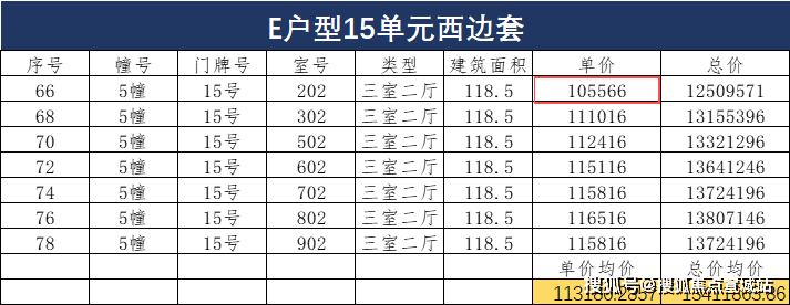 小高层119㎡户型中,单价最高的为12单元,主要原因在于这个单元与东边套139㎡户型拼接,得房率相对更高——在套内面积与13单元同户型相近的情况下,产权面积比13单元中间套小了近3㎡,因此单价略高。