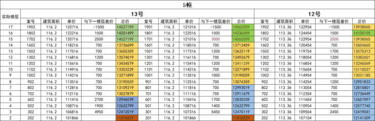 从5楼开始,单价呈现小幅阶梯式上涨,直至实际楼层14-15楼出现一次较大幅度跳价,这主要考虑到高楼层拥有更开阔的视野与居住舒适度。