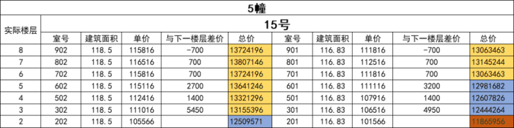 本次首开的5号楼中,15单元洋房整体均价相对较低,这主要是由于没有高楼层拉升价格。但若对比同楼层单价,洋房119㎡西边套实则是同面积段中单价最高的,洋房中间套价格是最划算的。
