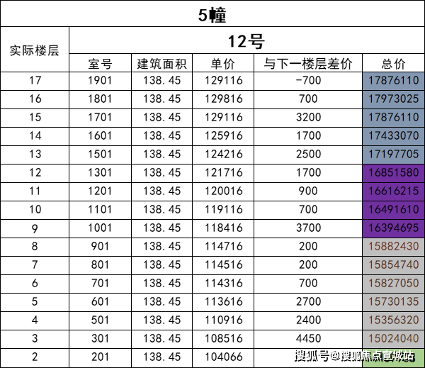东边套139㎡户型的定价逻辑则有所不同,各楼层之间存在更为明显的价格差异。