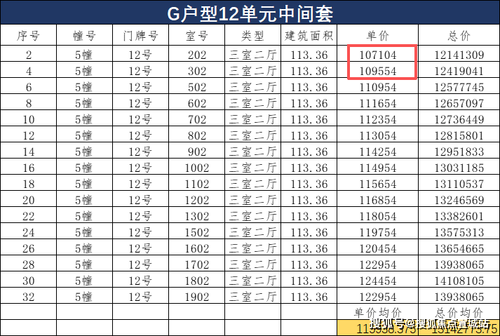中间套G户型119㎡三室两厅两卫,单价均价约11.40万/㎡,总价均价约1316万。