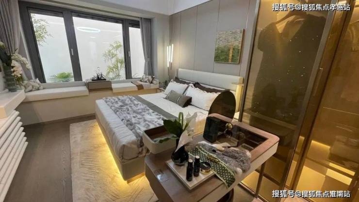主卧豪华套房,预留衣帽间空间,配备独立卫浴,且配置双台盆+大浴缸,以五星级酒店式的卫浴配置,演绎居家生活的奢享;主卧打造南向大飘窗,配合以转角采光窗,呈现未来轻办公与午后茶饮的最佳空间。