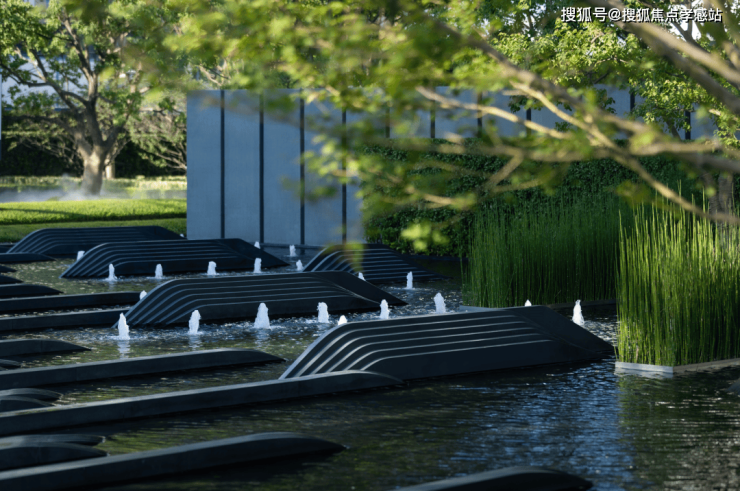 并通过跌水、涌泉和镜面水景等水景组合,使整个项目空间更灵动,也与黄浦江形成内外呼应。